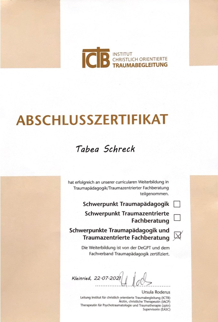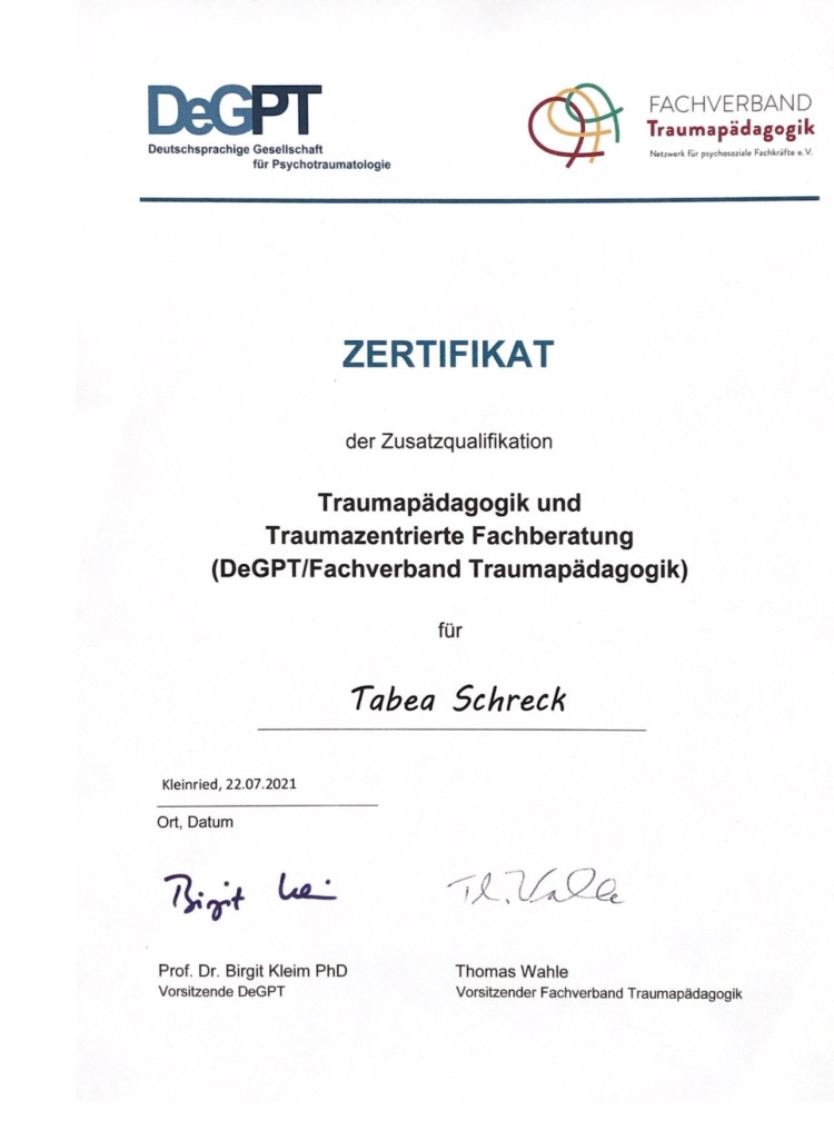 - Traumazentrierte Fachberaterin und Traumapädagogik (ICTB) zertifiziert durch DeGPT